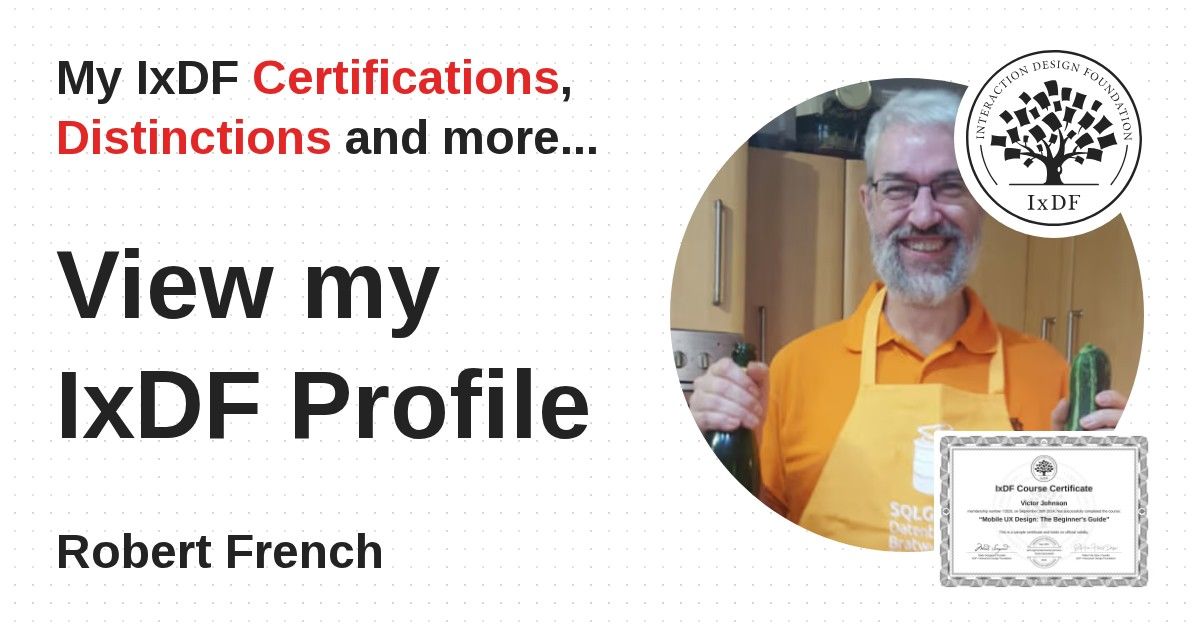 IxDF Course Certificates are awarded to Robert French in formal recognition of their coursework surpassing the rigorous benchmarks of exceptional performance established by the IxDF Educational Codex.