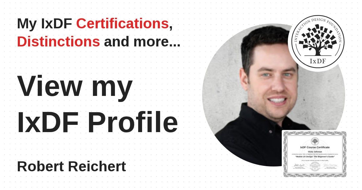 IxDF Course Certificates are awarded to Robert Reichert in formal recognition of their coursework surpassing the rigorous benchmarks of exceptional performance established by the IxDF Educational Codex.