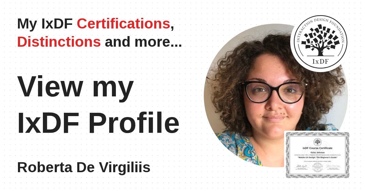 IxDF Course Certificates are awarded to Roberta De Virgiliis in formal recognition of their coursework surpassing the rigorous benchmarks of exceptional performance established by the IxDF Educational Codex.