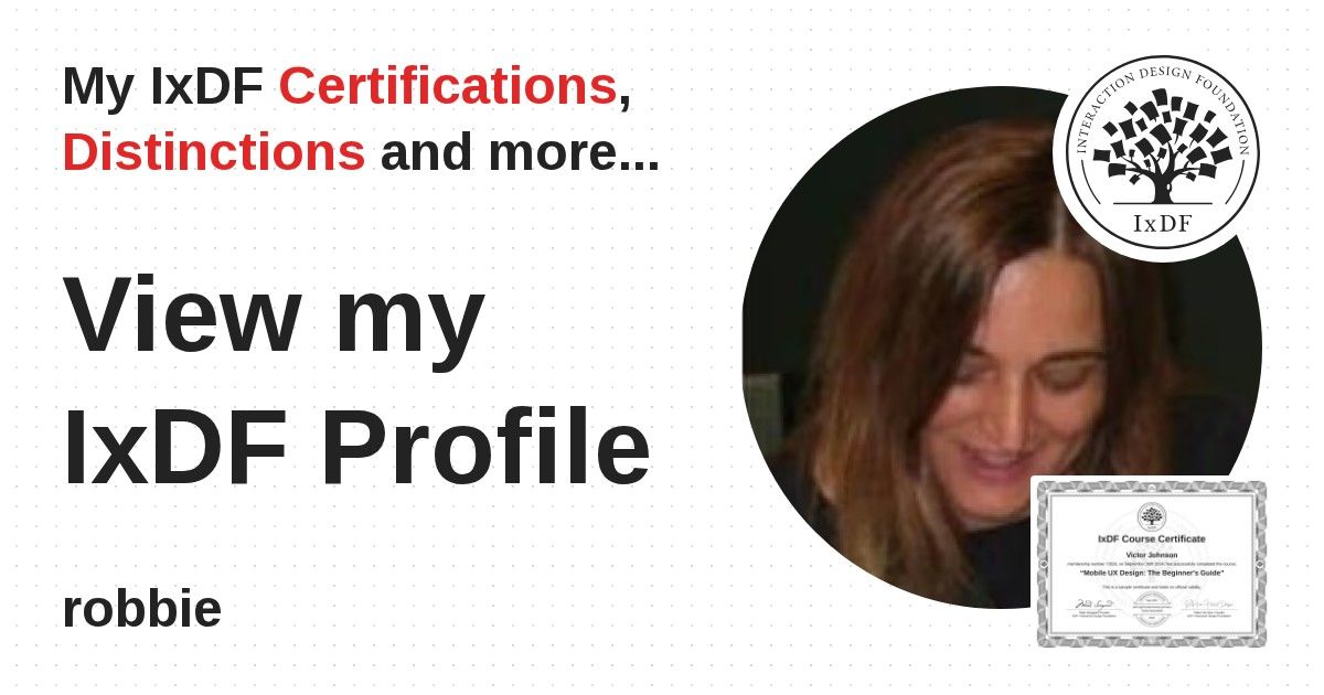 IxDF Course Certificates are awarded to robbie in formal recognition of their coursework surpassing the rigorous benchmarks of exceptional performance established by the IxDF Educational Codex.
