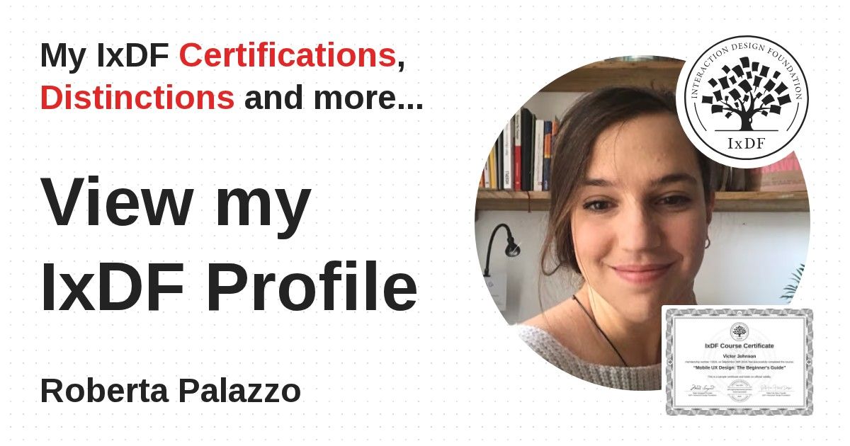 IxDF Course Certificates are awarded to Roberta Palazzo in formal recognition of their coursework surpassing the rigorous benchmarks of exceptional performance established by the IxDF Educational Codex.