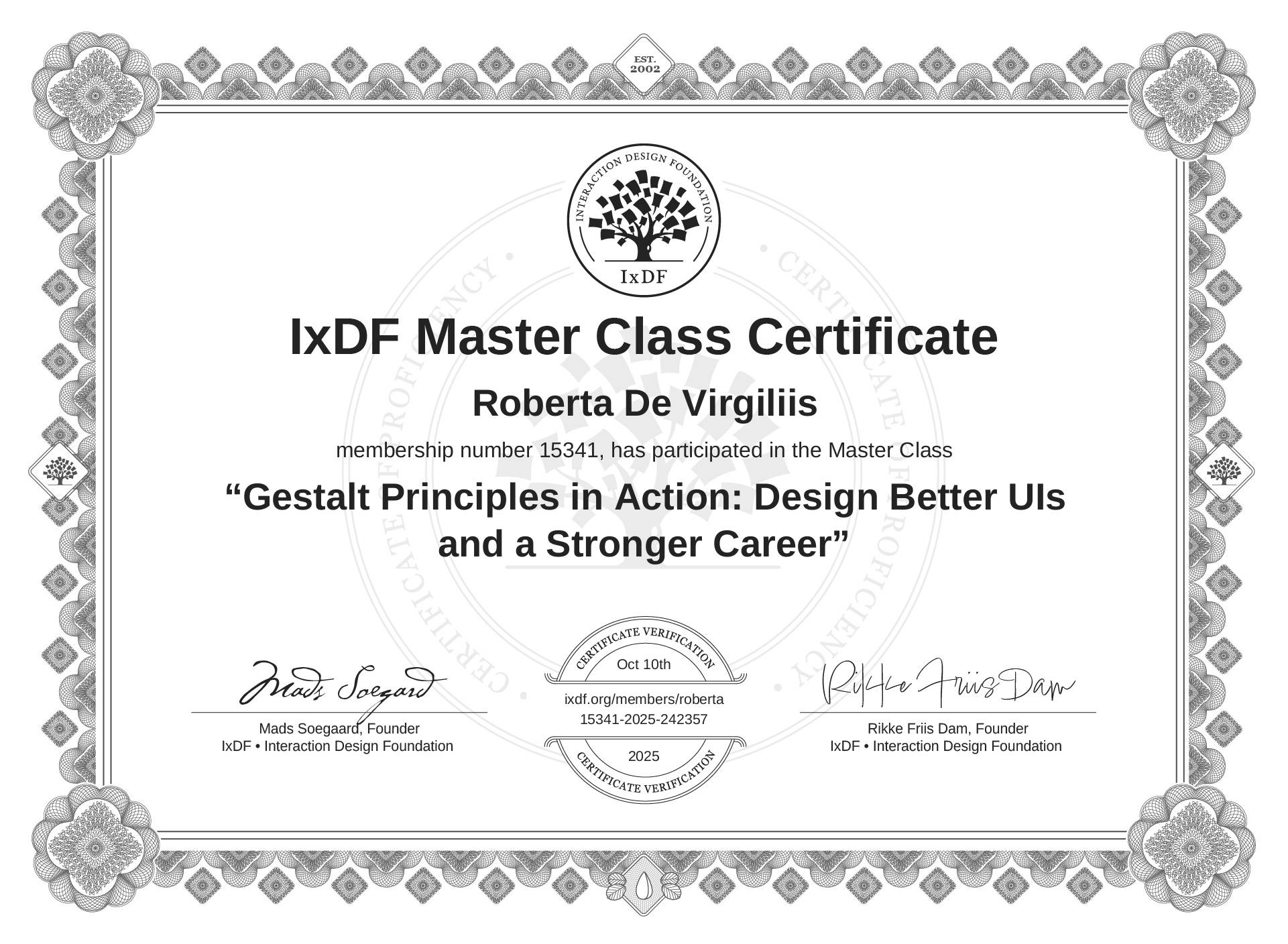 IxDF Master Class Certificate awarded to Roberta De Virgiliis for attending the "Gestalt Principles in Action: Design Better UIs and a Stronger Career" Master Class