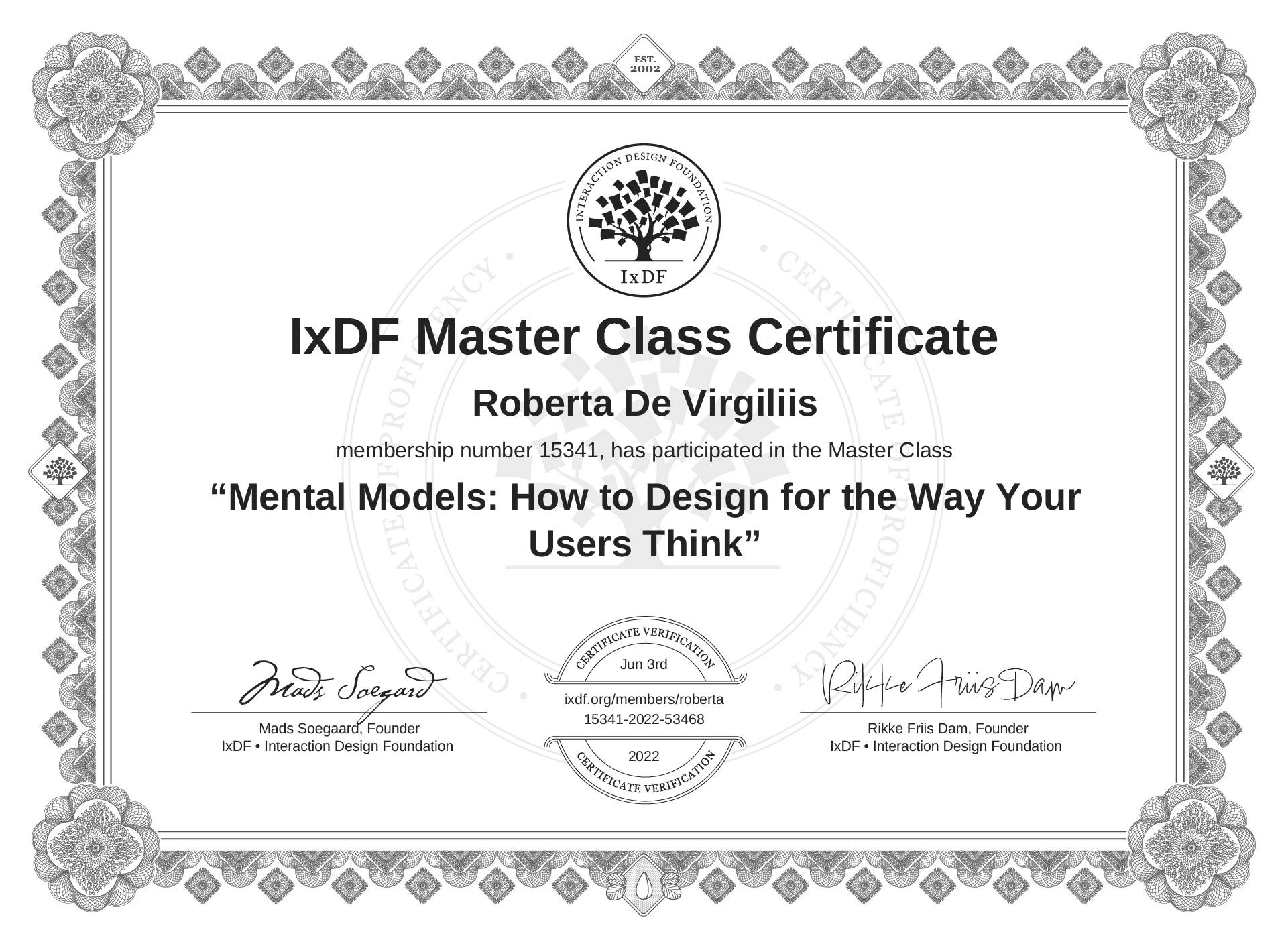 IxDF Master Class Certificate awarded to Roberta De Virgiliis for attending the "Mental Models: How to Design for the Way Your Users Think" Master Class
