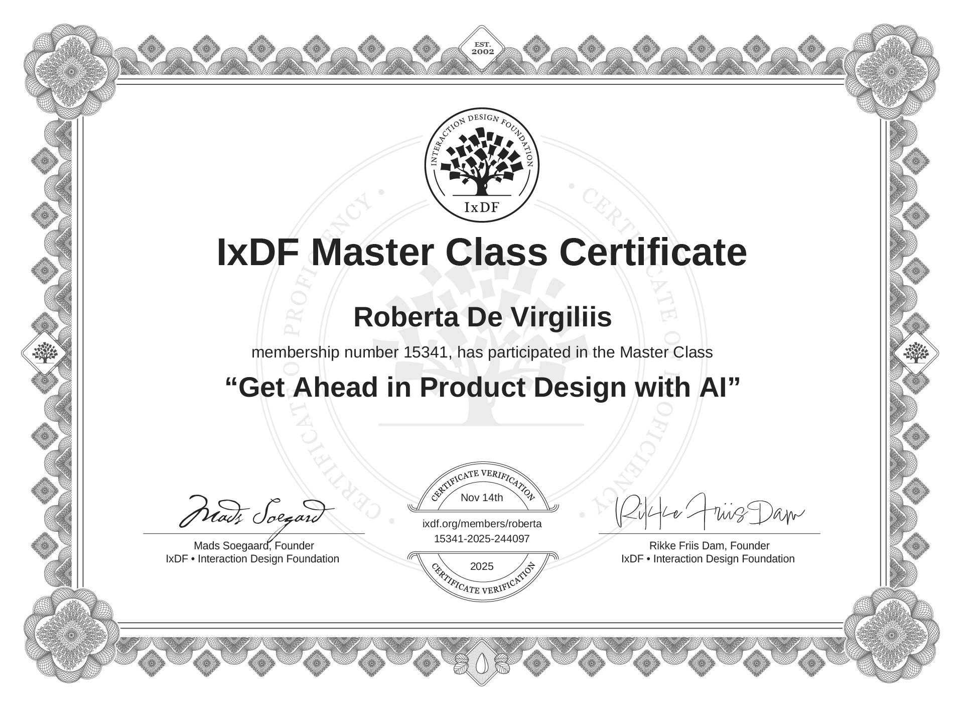 The IxDF Master Class Certificate (ID #mcc_c3b0250da2cc44f59ec198840d2da158) above is awarded to Roberta De Virgiliis