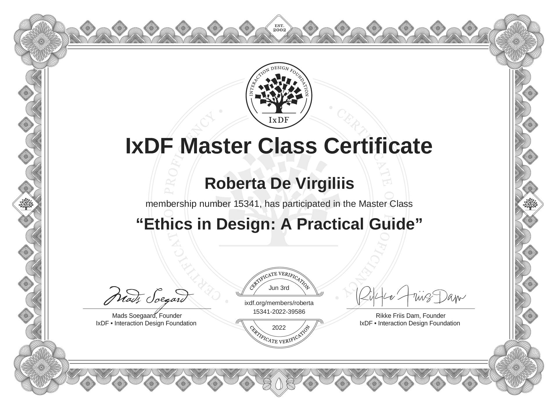 This IxDF Membership Certificate is issued to Roberta De Virgiliis