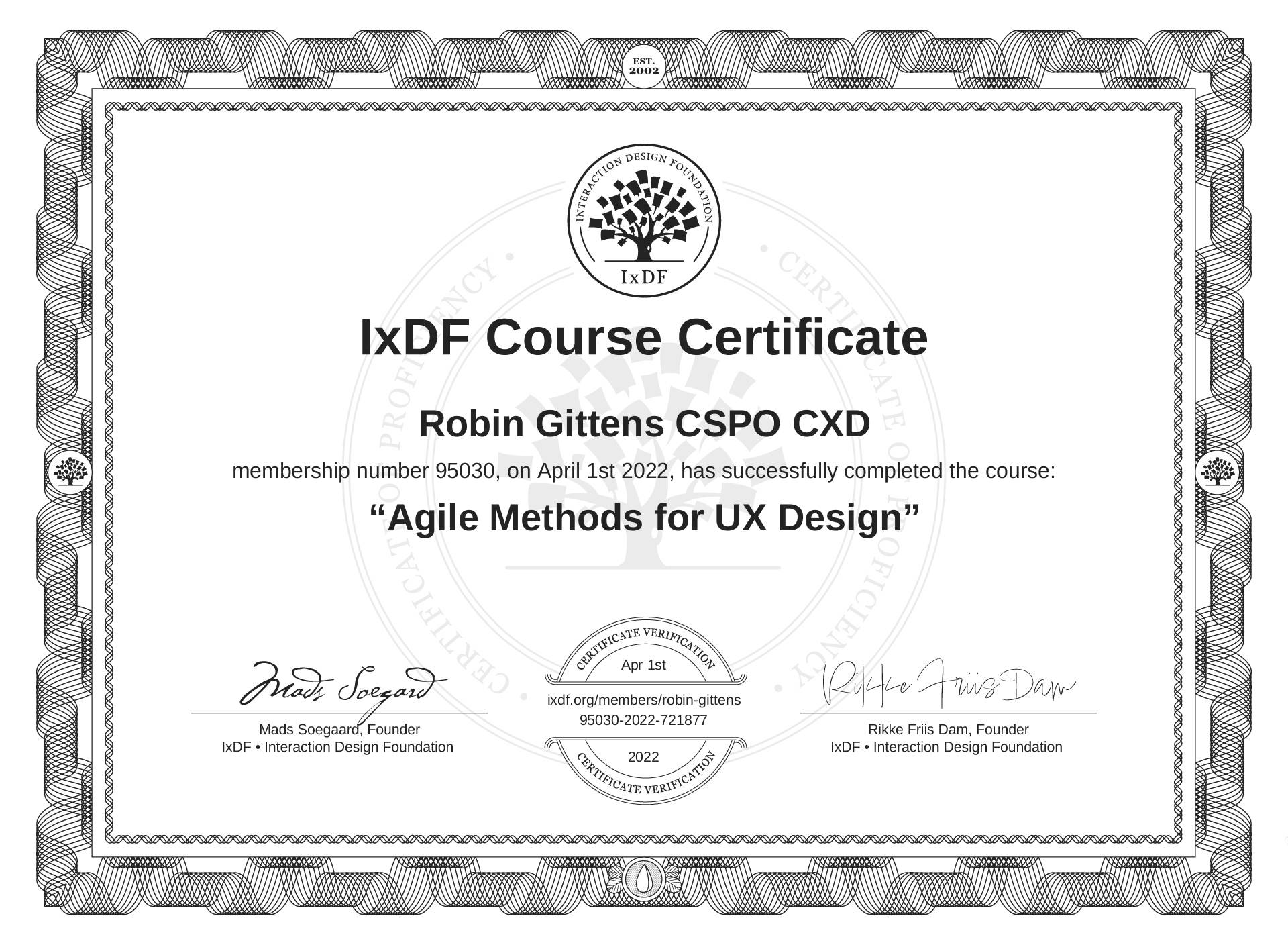 IxDF Course Certificates are awarded to Robin Gittens CSPO CXD in formal recognition of their coursework surpassing the rigorous benchmarks of exceptional performance established by the IxDF Educational Codex.