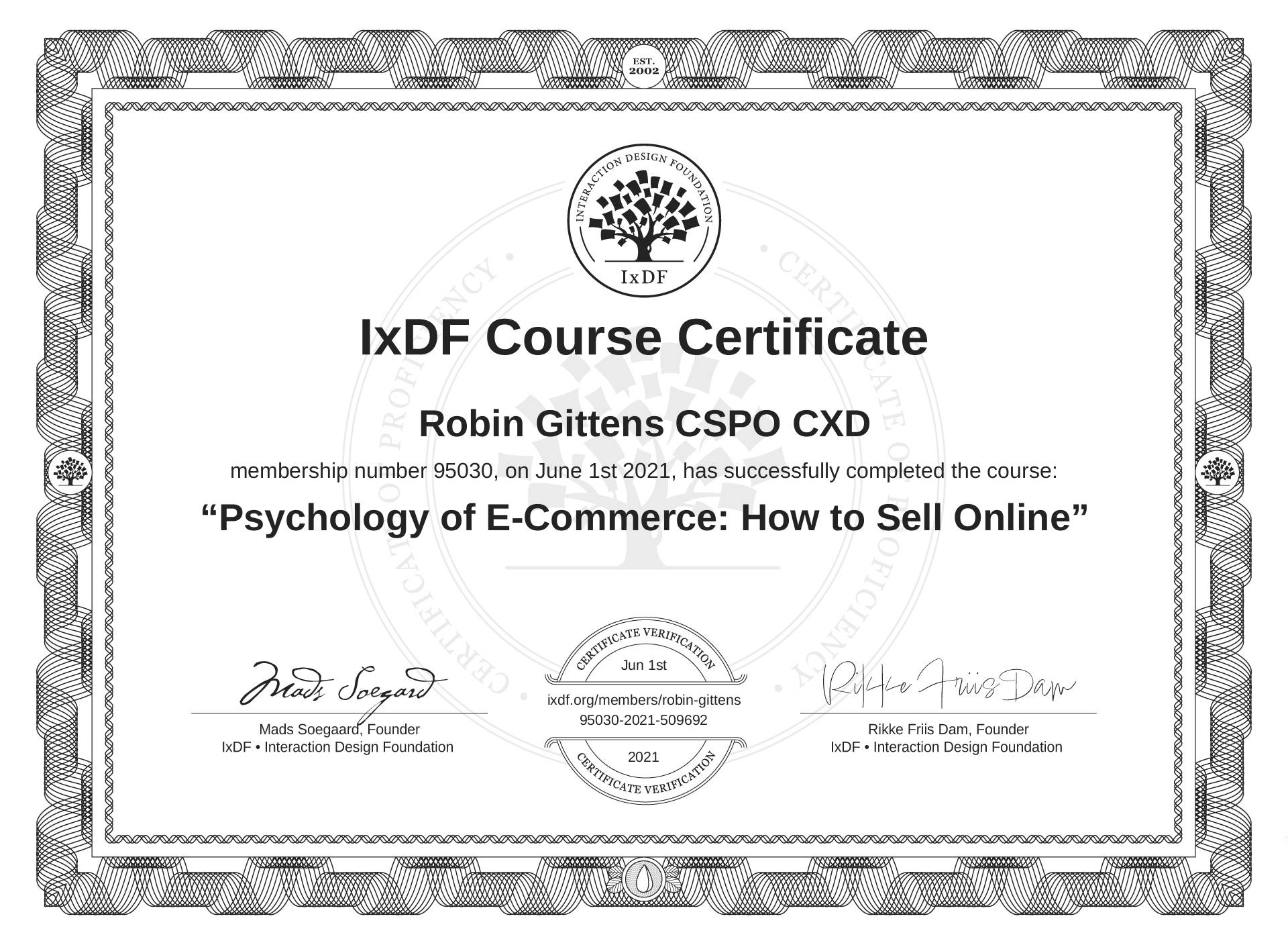 The IxDF Course Certificate (ID #e3a81f82-a022-410a-855e-1d0fba5517e8) above is awarded to Robin Gittens CSPO CXD