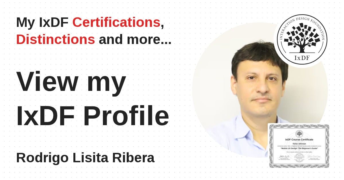 IxDF Course Certificates are awarded to Rodrigo Lisita Ribera in formal recognition of their coursework surpassing the rigorous benchmarks of exceptional performance established by the IxDF Educational Codex.