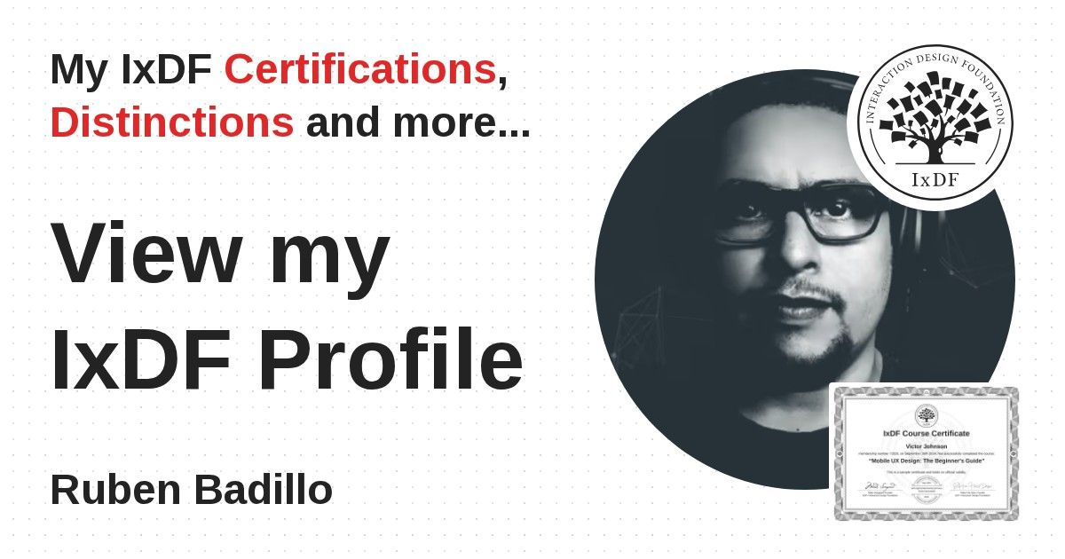 IxDF Course Certificates are awarded to Ruben Badillo in formal recognition of their coursework surpassing the rigorous benchmarks of exceptional performance established by the IxDF Educational Codex.