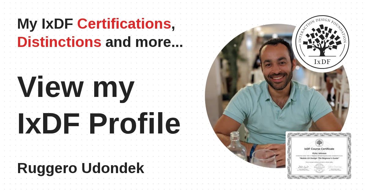 IxDF Course Certificates are awarded to Ruggero Udondek in formal recognition of their coursework surpassing the rigorous benchmarks of exceptional performance established by the IxDF Educational Codex.