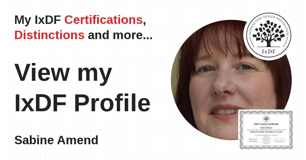 IxDF Course Certificates are awarded to Sabine Amend in formal recognition of their coursework surpassing the rigorous benchmarks of exceptional performance established by the IxDF Educational Codex.