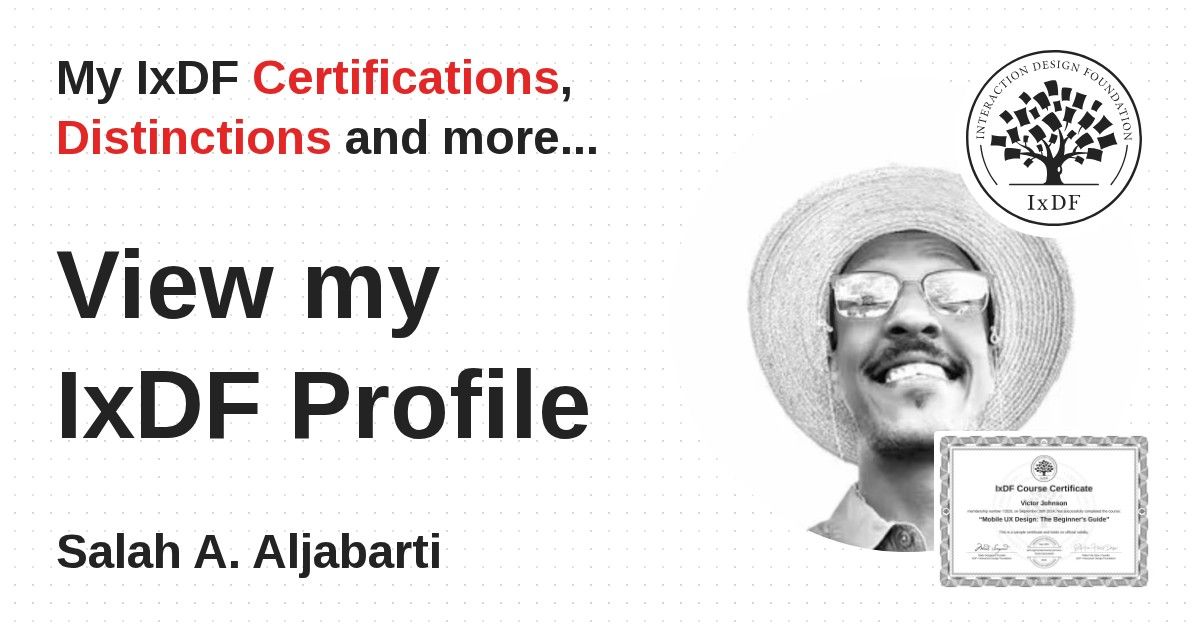 IxDF Course Certificates are awarded to Salah A. Aljabarti in formal recognition of their coursework surpassing the rigorous benchmarks of exceptional performance established by the IxDF Educational Codex.
