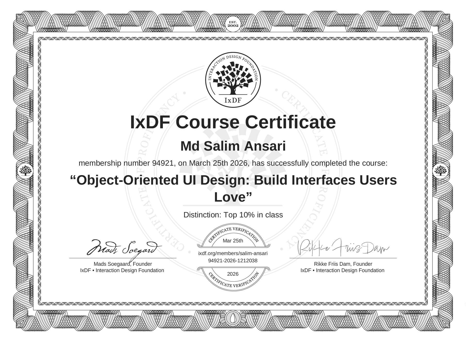 The IxDF Course Certificate (ID #211f39c7-23ce-437a-8ec1-389207bc8362) above is awarded to Md Salim Ansari