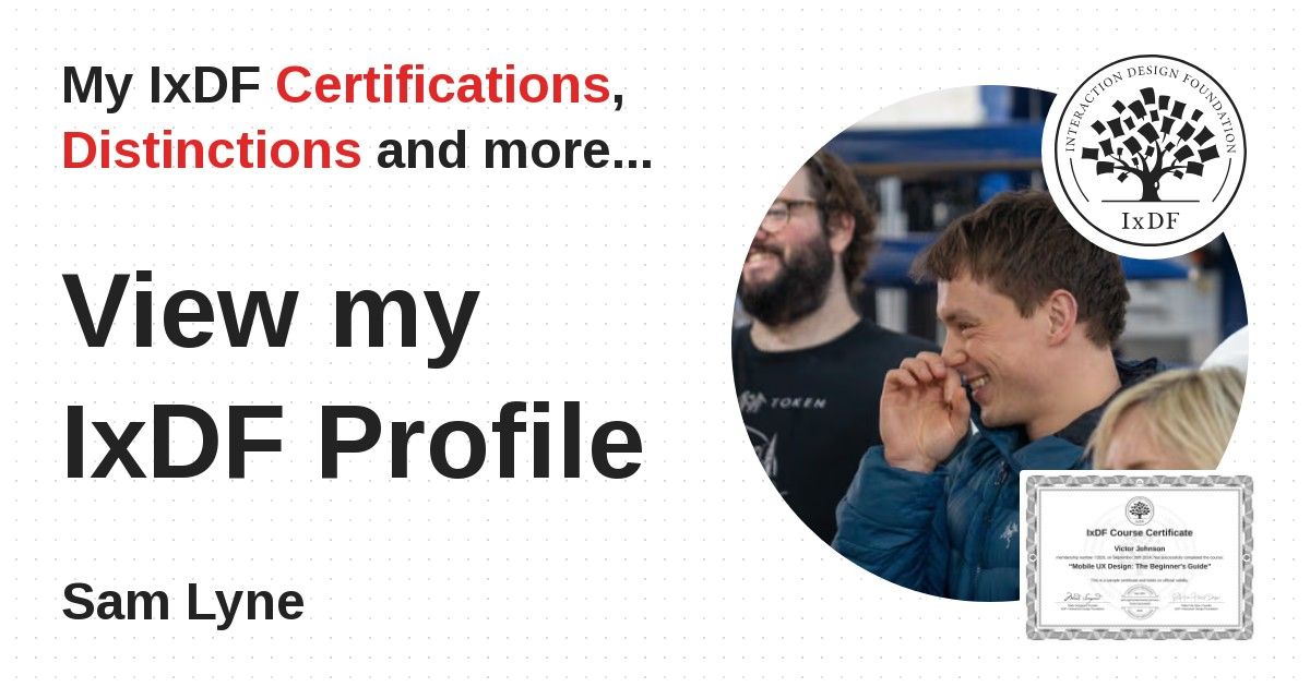 IxDF Course Certificates are awarded to Sam Lyne in formal recognition of their coursework surpassing the rigorous benchmarks of exceptional performance established by the IxDF Educational Codex.