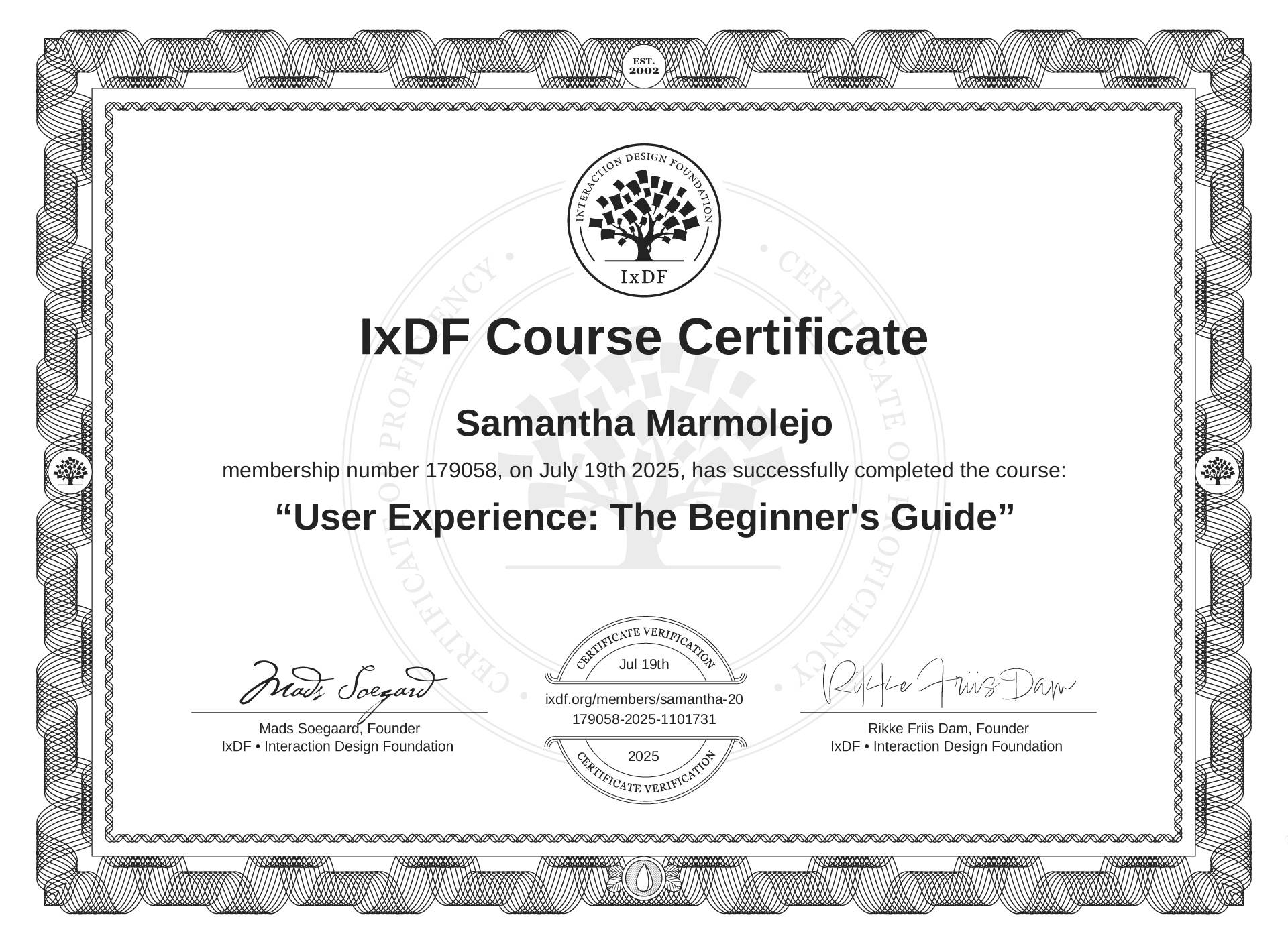 This IxDF Membership Certificate is issued to Samantha Marmolejo