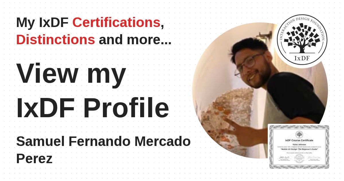 IxDF Course Certificates are awarded to Samuel Fernando Mercado Perez in formal recognition of their coursework surpassing the rigorous benchmarks of exceptional performance established by the IxDF Educational Codex.