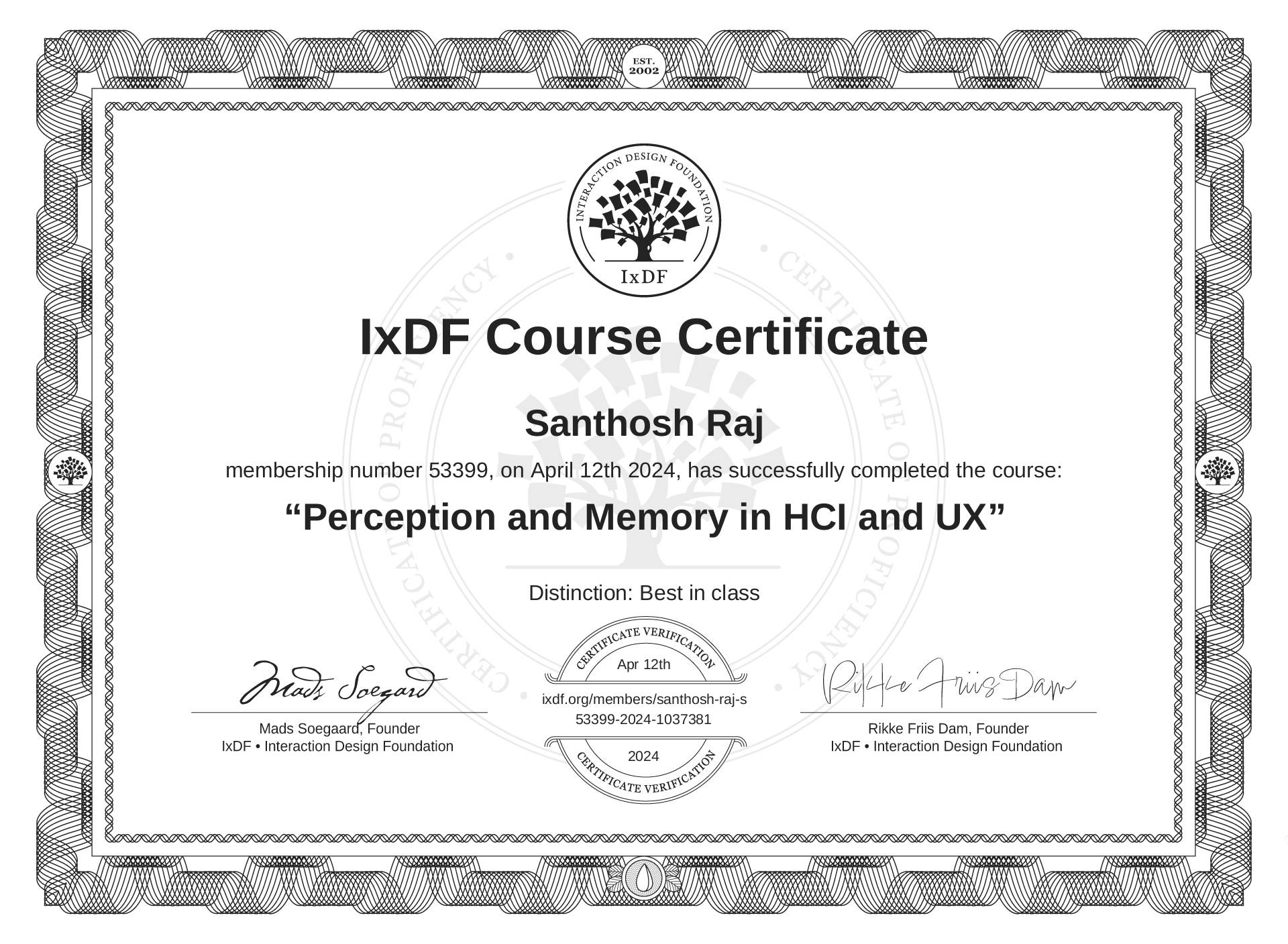 The IxDF Course Certificate (ID #11b506f3-8344-409d-bc2f-a733ead185c9) above is awarded to Santhosh Raj with a Best in Class Distinction in formal recognition of their coursework surpassing the rigorous benchmarks of exceptional performance established by the IxDF Educational Codex. View Course Curriculum.