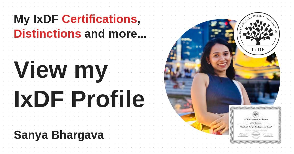 Distinctions are conferred upon Sanya Bhargava in formal recognition of their notable achievements and contributions, as stipulated by the IxDF Educational Codex.