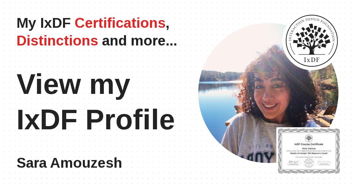 IxDF Course Certificates are awarded to Sara Amouzesh in formal recognition of their coursework surpassing the rigorous benchmarks of exceptional performance established by the IxDF Educational Codex.