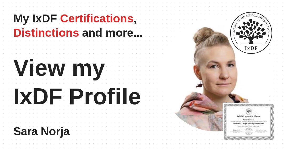 IxDF Course Certificates are awarded to Sara Norja in formal recognition of their coursework surpassing the rigorous benchmarks of exceptional performance established by the IxDF Educational Codex.