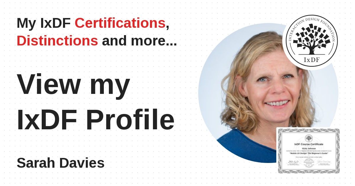 This IxDF Membership Certificate is issued to Sarah Davies in formal recognition of their membership of the IxDF, global leader in design education.