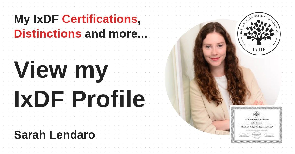 IxDF Course Certificates are awarded to Sarah Lendaro in formal recognition of their coursework surpassing the rigorous benchmarks of exceptional performance established by the IxDF Educational Codex.