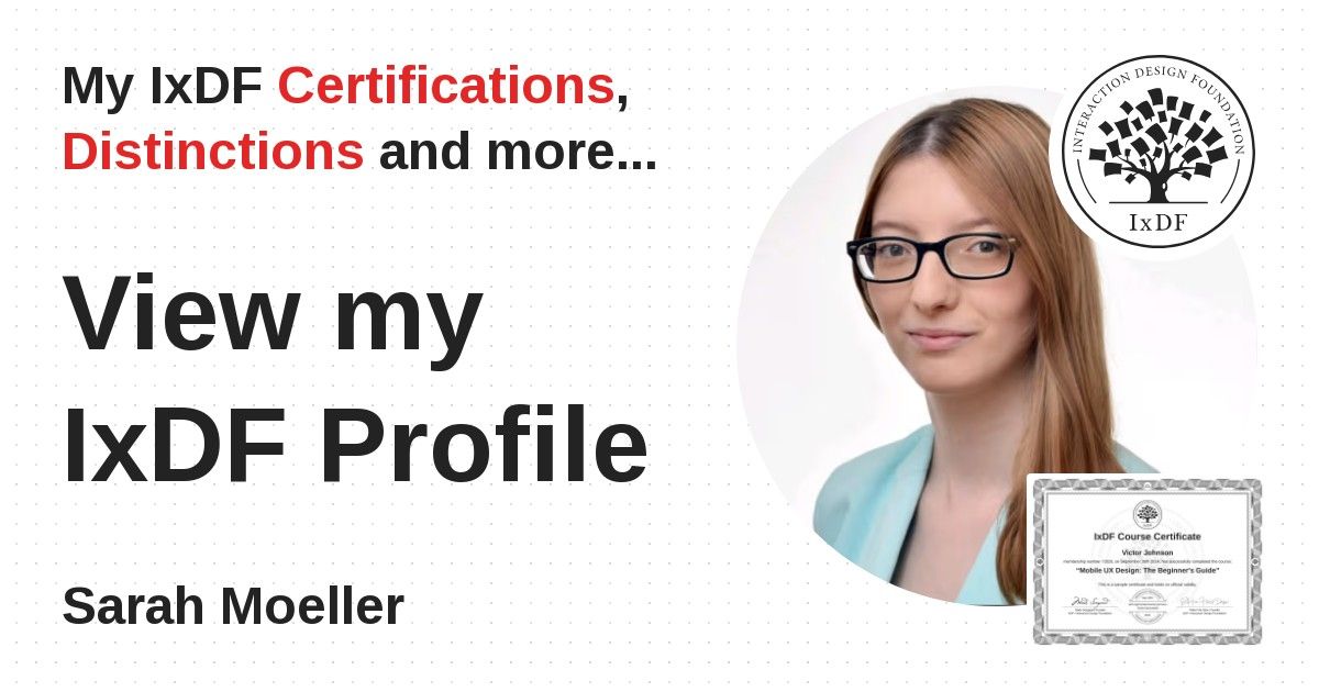 IxDF Course Certificates are awarded to Sarah Moeller in formal recognition of their coursework surpassing the rigorous benchmarks of exceptional performance established by the IxDF Educational Codex.