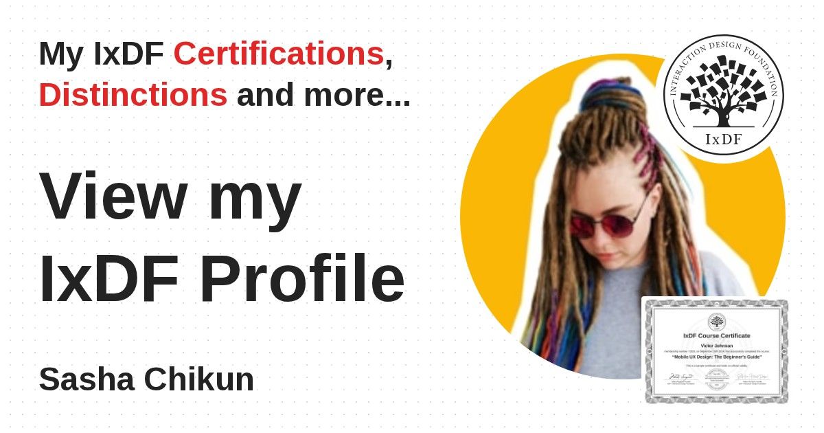 IxDF Course Certificates are awarded to Sasha Chikun in formal recognition of their coursework surpassing the rigorous benchmarks of exceptional performance established by the IxDF Educational Codex.