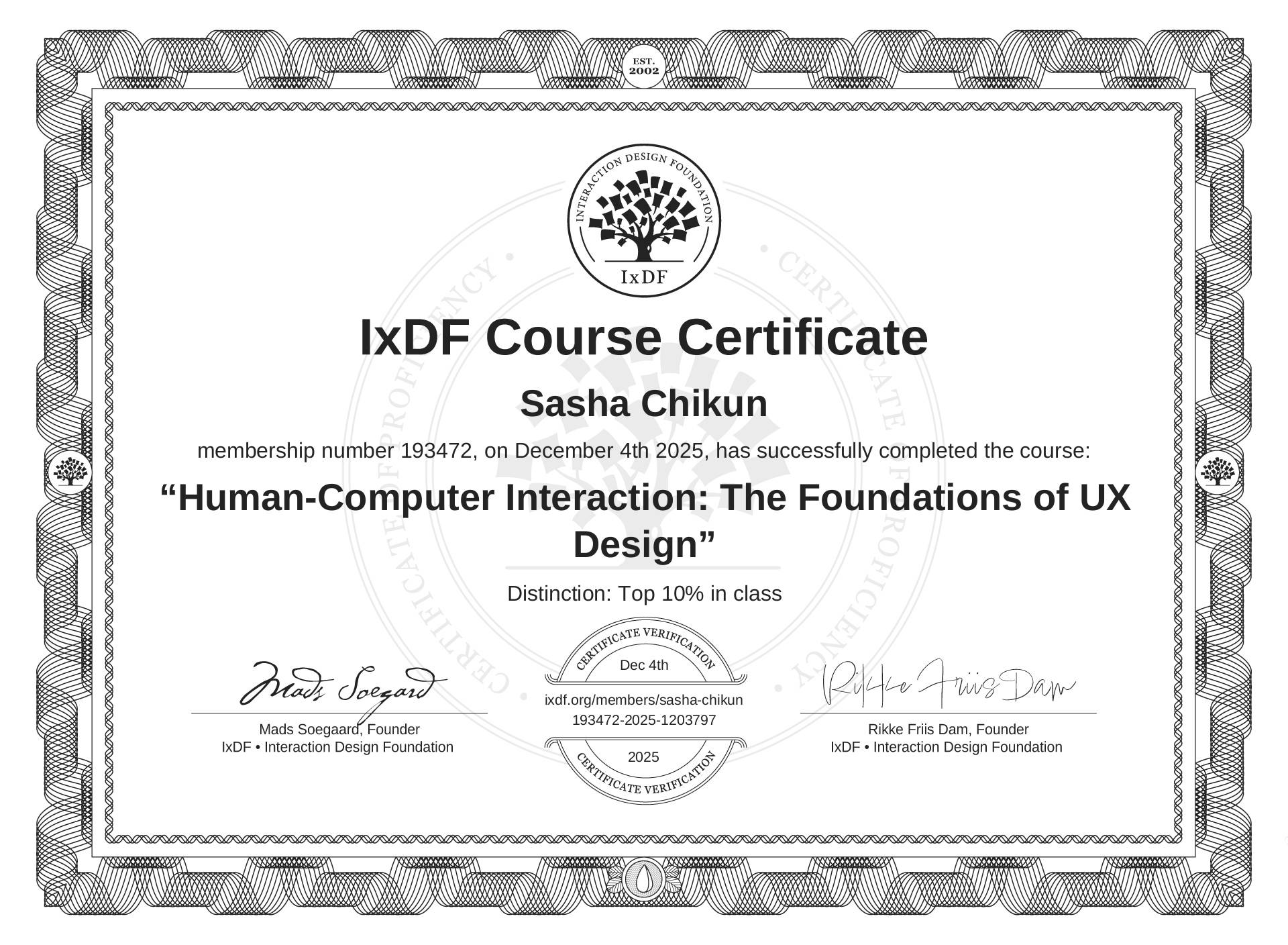 IxDF Course Certificate awarded to Sasha Chikun for completing the "Human-Computer Interaction: The Foundations of UX Design" course