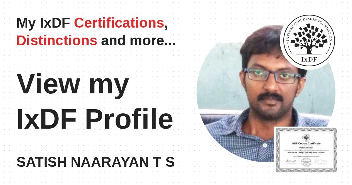 IxDF Course Certificates are awarded to SATISH NAARAYAN T S in formal recognition of their coursework surpassing the rigorous benchmarks of exceptional performance established by the IxDF Educational Codex.