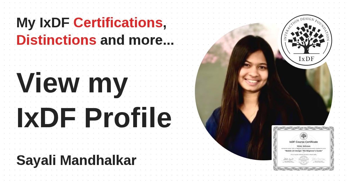IxDF Course Certificates are awarded to Sayali Mandhalkar in formal recognition of their coursework surpassing the rigorous benchmarks of exceptional performance established by the IxDF Educational Codex.