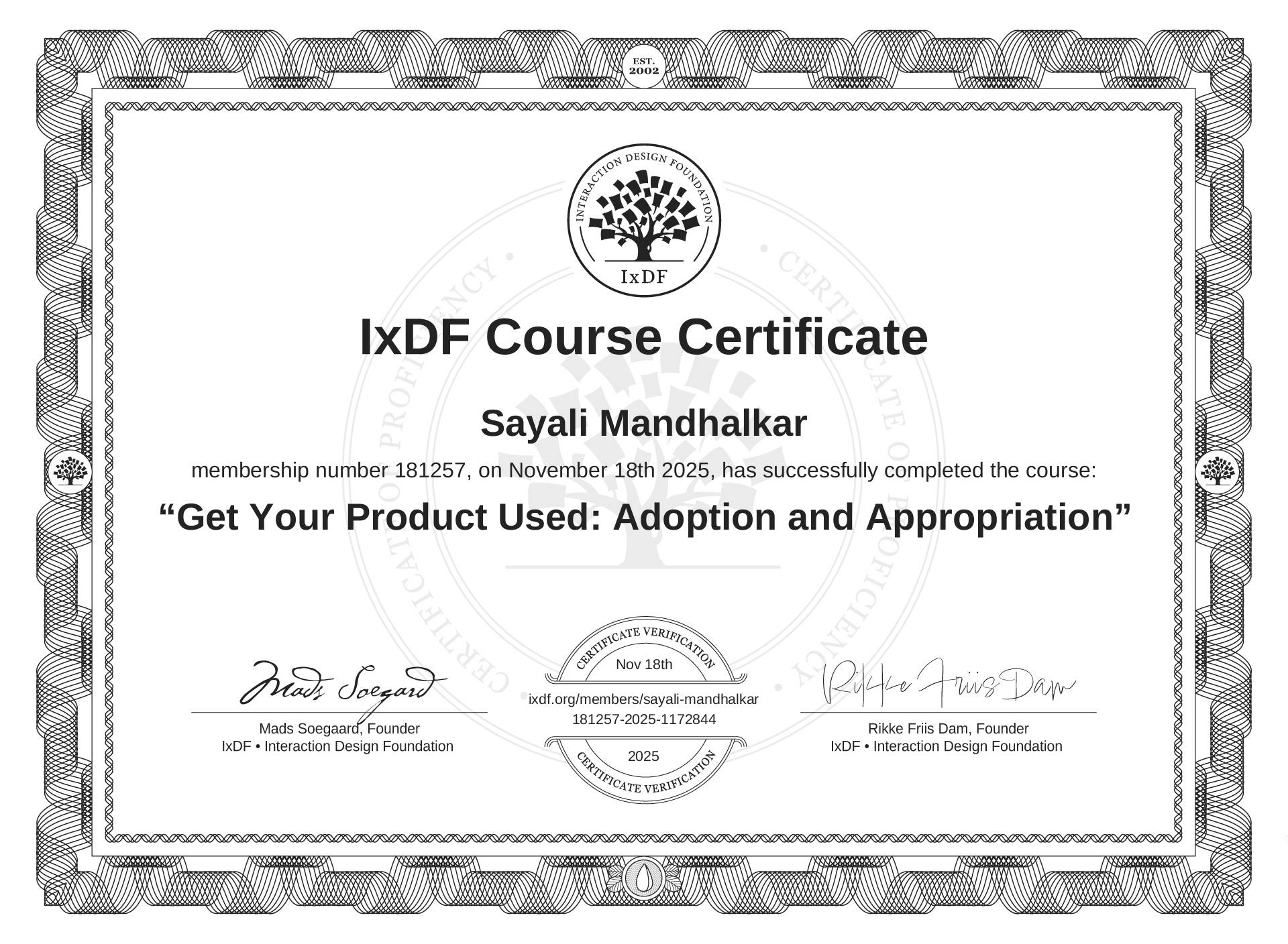 This IxDF Membership Certificate is issued to Sayali Mandhalkar