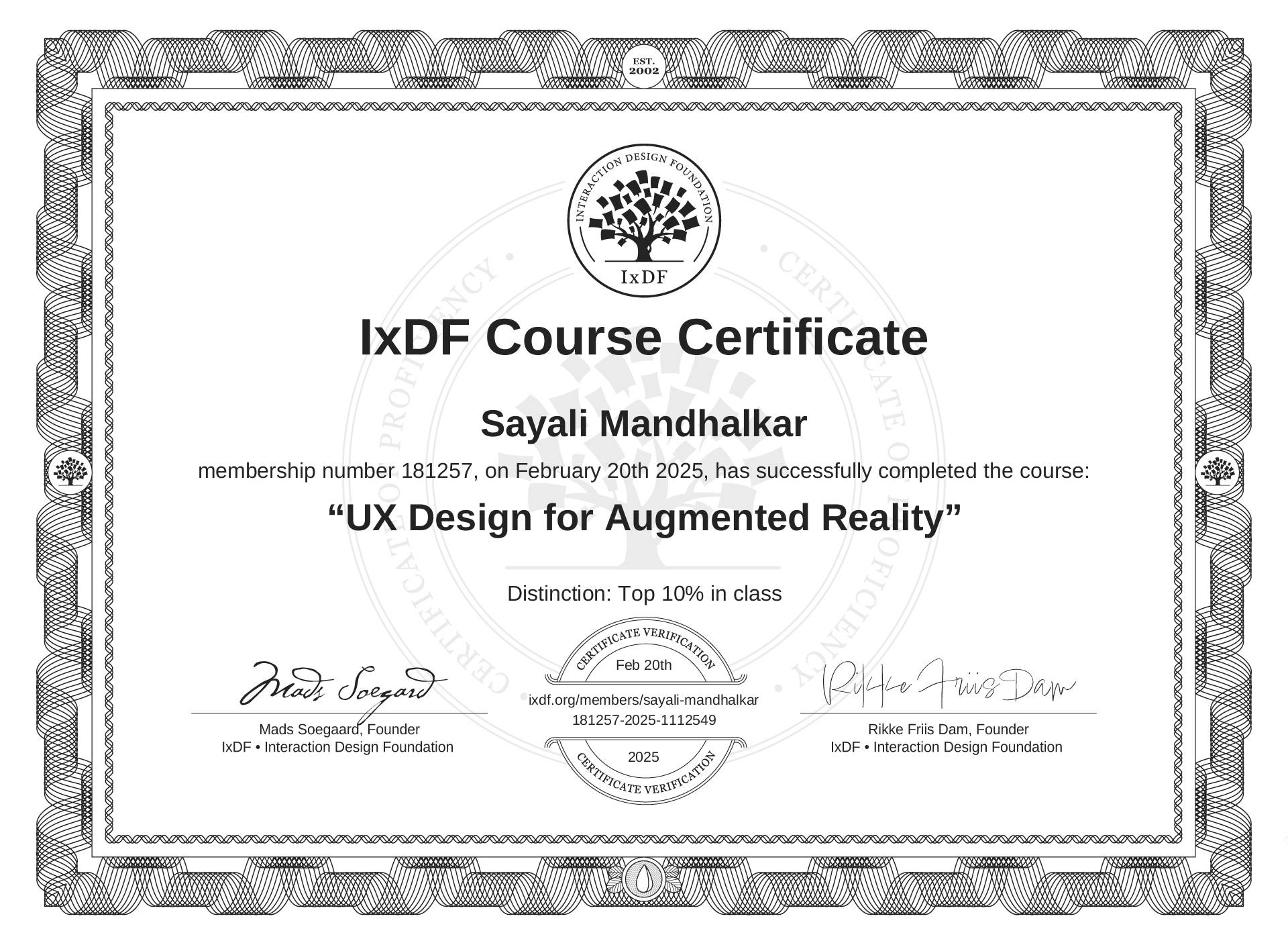 This IxDF Membership Certificate is issued to Sayali Mandhalkar