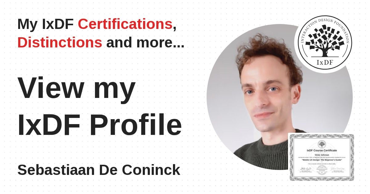 IxDF Course Certificates are awarded to Sebastiaan De Coninck in formal recognition of their coursework surpassing the rigorous benchmarks of exceptional performance established by the IxDF Educational Codex.