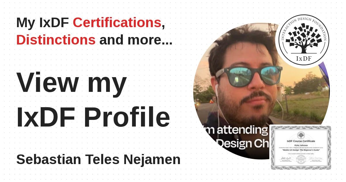 IxDF Course Certificates are awarded to Sebastian Teles Nejamen in formal recognition of their coursework surpassing the rigorous benchmarks of exceptional performance established by the IxDF Educational Codex.