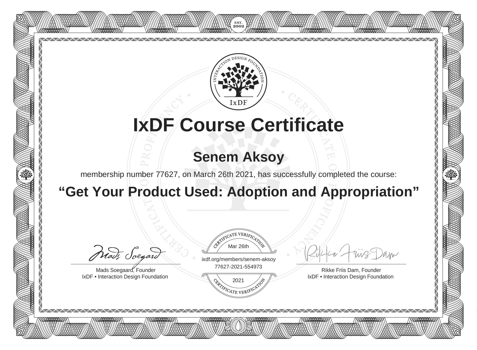 Senem Aksoy's Course Certificate: Get Your Product Used: Adoption and Appropriation
