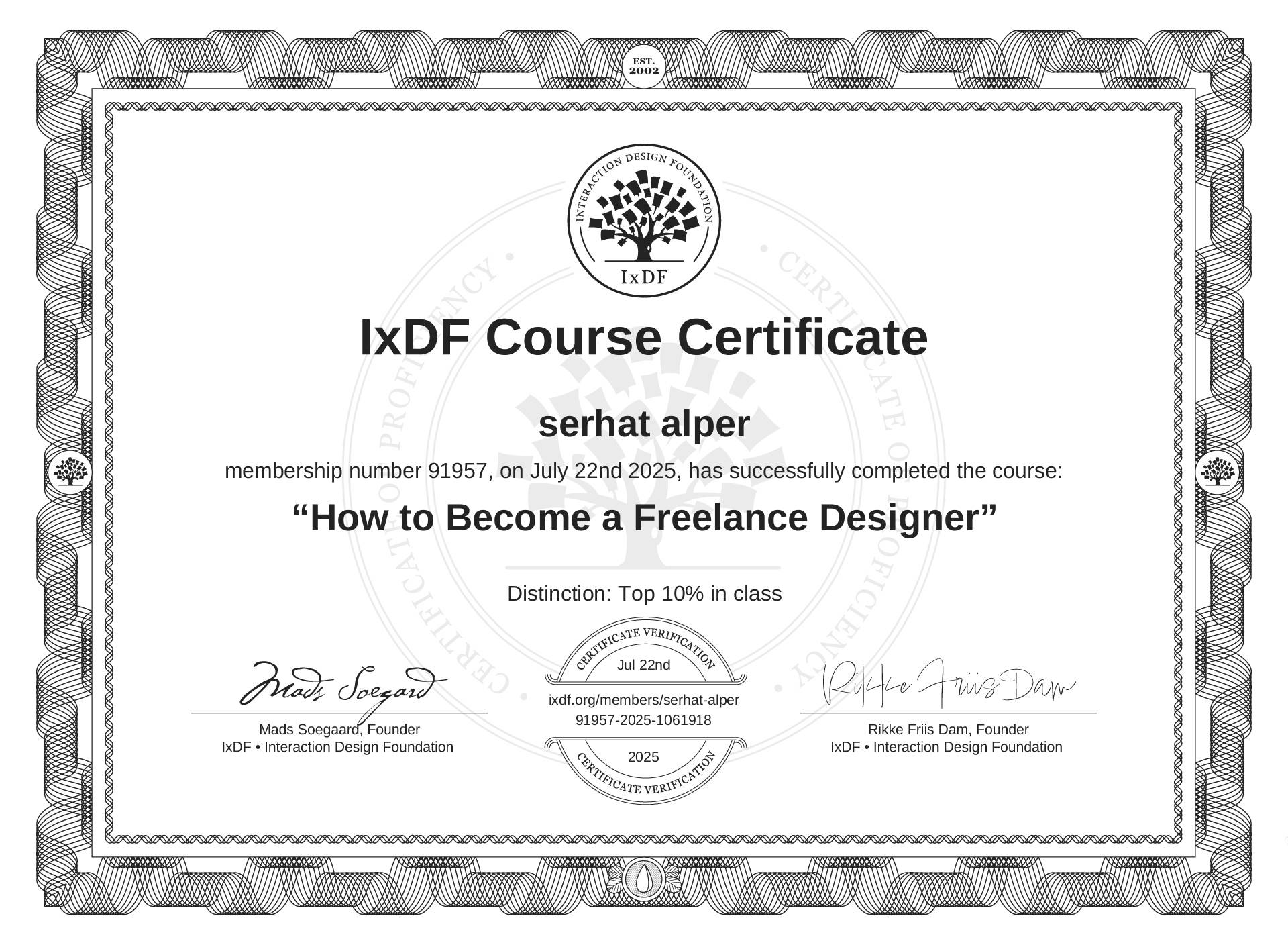 This IxDF Membership Certificate is issued to serhat alper in formal recognition of their membership of the IxDF, global leader in design education.