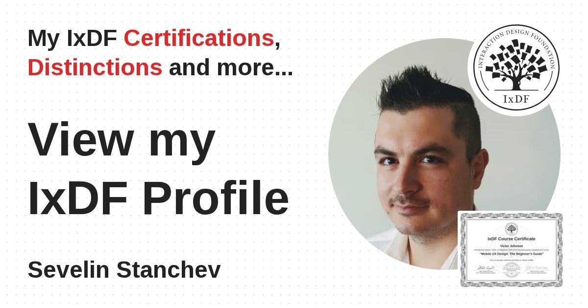 IxDF Course Certificates are awarded to Sevelin Stanchev in formal recognition of their coursework surpassing the rigorous benchmarks of exceptional performance established by the IxDF Educational Codex.