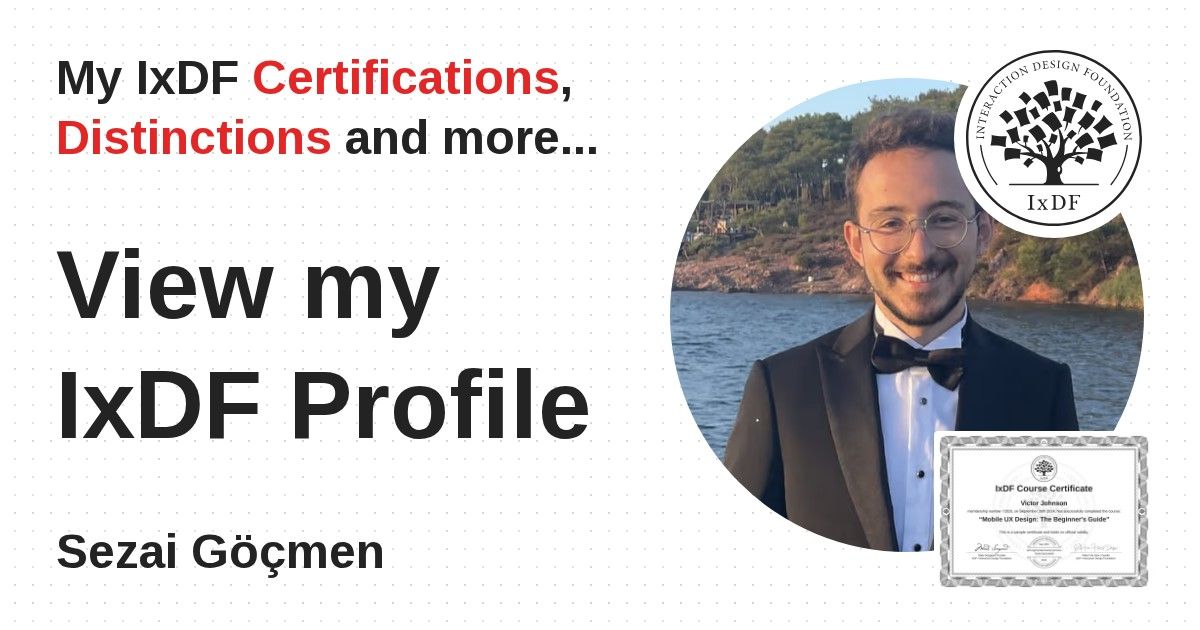 IxDF Course Certificates are awarded to Sezai Göçmen in formal recognition of their coursework surpassing the rigorous benchmarks of exceptional performance established by the IxDF Educational Codex.