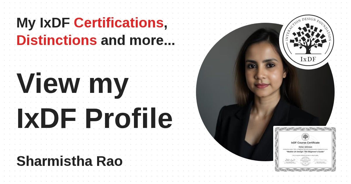 Distinctions are conferred upon Sharmistha Rao in formal recognition of their notable achievements and contributions, as stipulated by the IxDF Educational Codex.