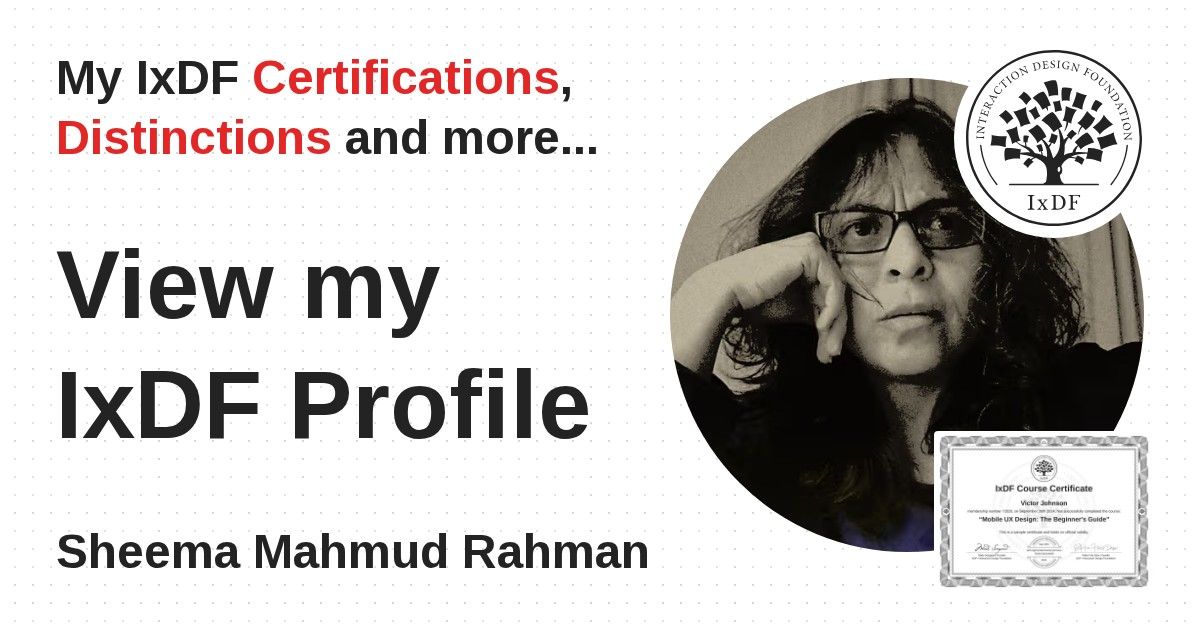 IxDF Course Certificates are awarded to Sheema Mahmud Rahman in formal recognition of their coursework surpassing the rigorous benchmarks of exceptional performance established by the IxDF Educational Codex.