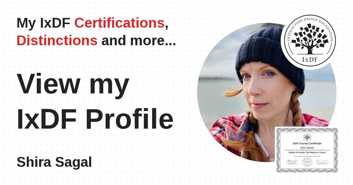 IxDF Course Certificates are awarded to Shira Sagal in formal recognition of their coursework surpassing the rigorous benchmarks of exceptional performance established by the IxDF Educational Codex.
