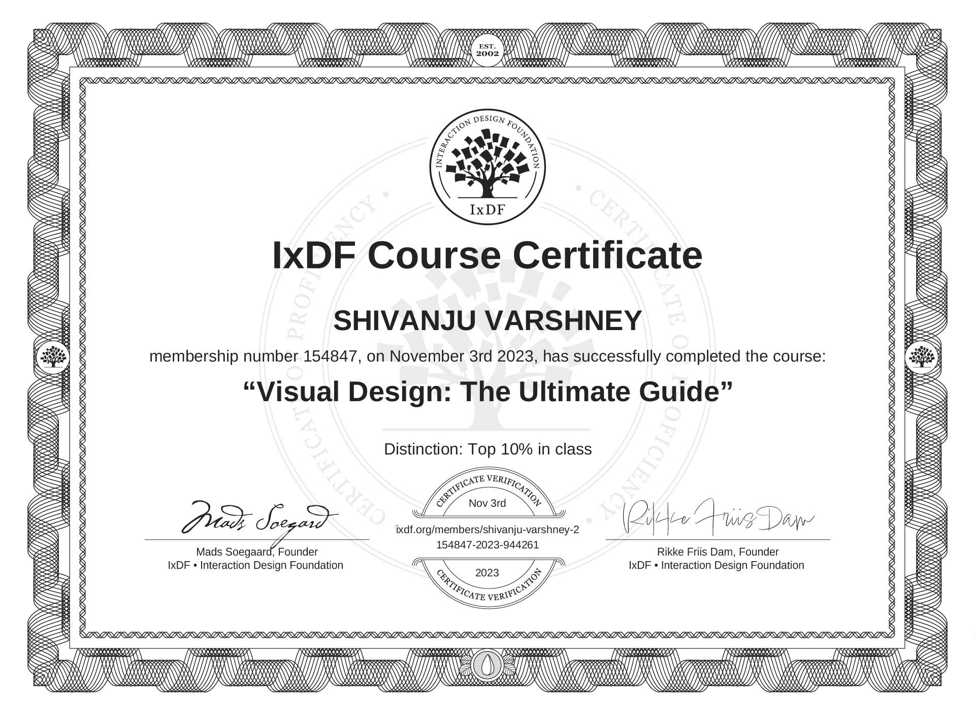 The IxDF Course Certificate (ID #f5663c82-4bc1-40f3-b6ba-96c8461269c9) above is awarded to SHIVANJU VARSHNEY