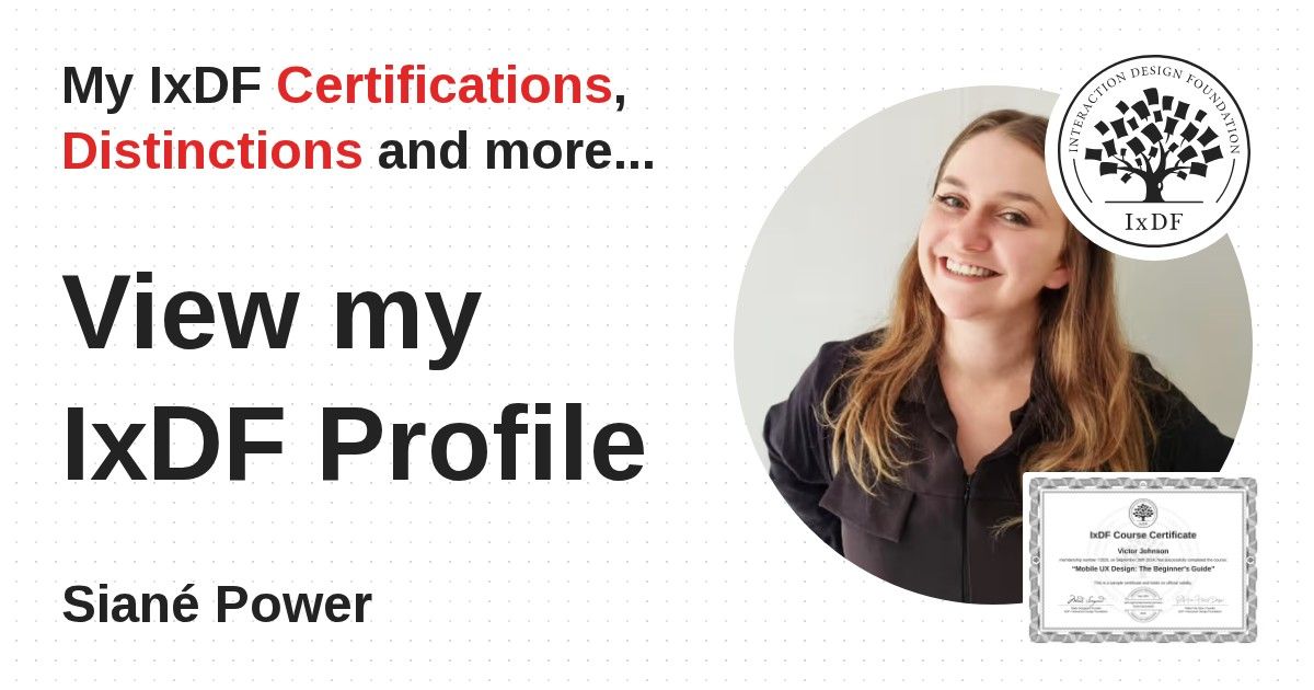 IxDF Course Certificates are awarded to Siané Power in formal recognition of their coursework surpassing the rigorous benchmarks of exceptional performance established by the IxDF Educational Codex.