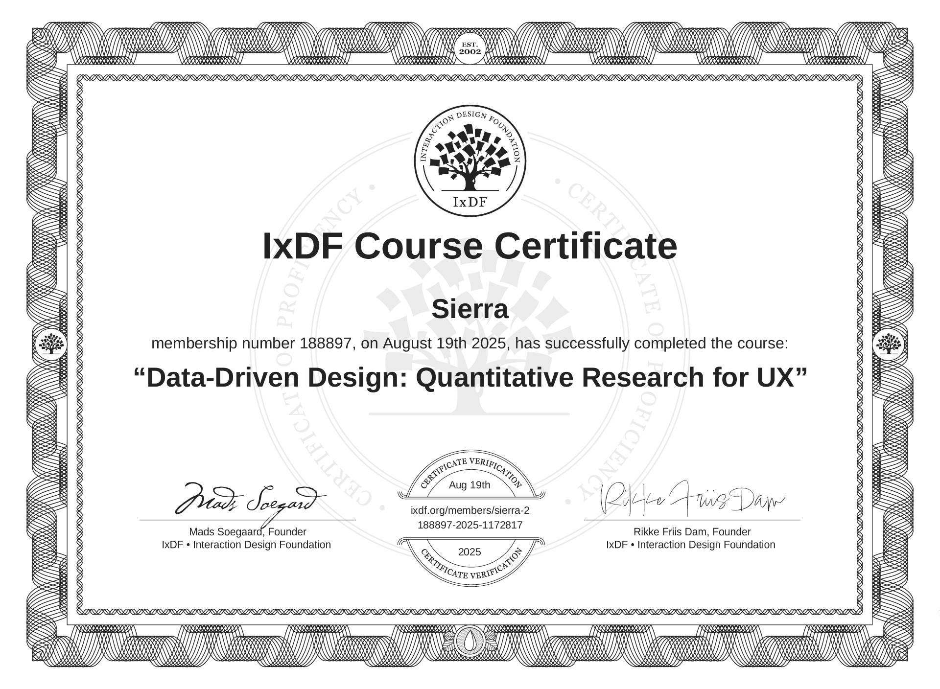 The IxDF Course Certificate (ID #0e1e2af2-f118-462b-9e43-3cecc5b49741) above is awarded to Sierra in formal recognition of their coursework surpassing the rigorous benchmarks of exceptional performance established by the IxDF Educational Codex. View Course Curriculum.