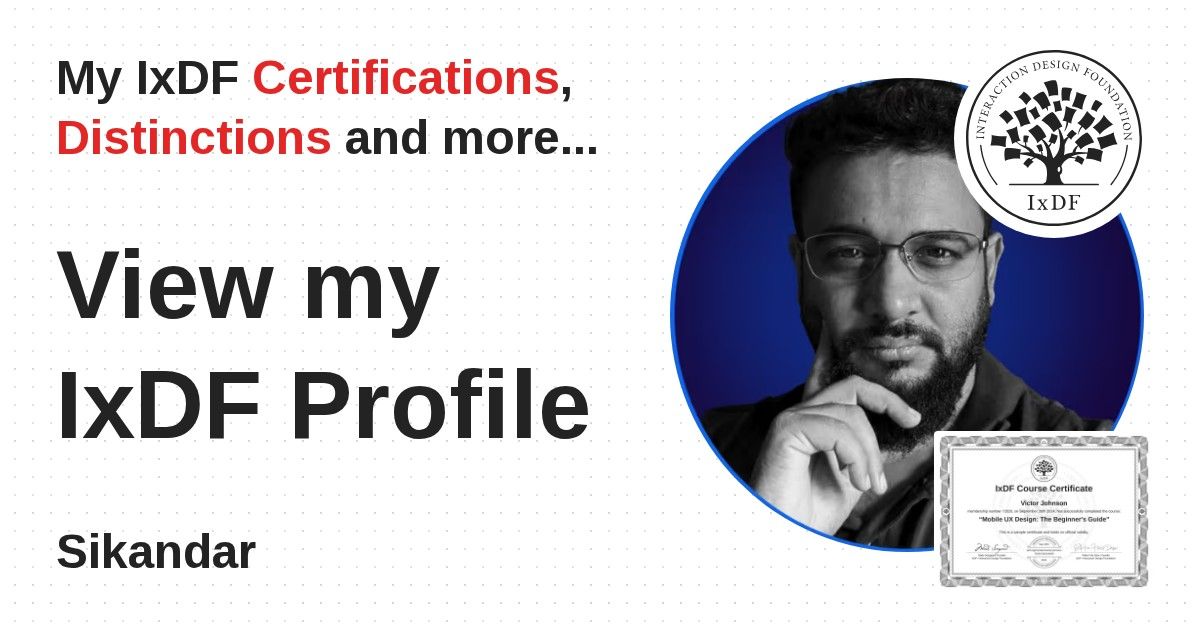 IxDF Course Certificates are awarded to Sikandar in formal recognition of their coursework surpassing the rigorous benchmarks of exceptional performance established by the IxDF Educational Codex.