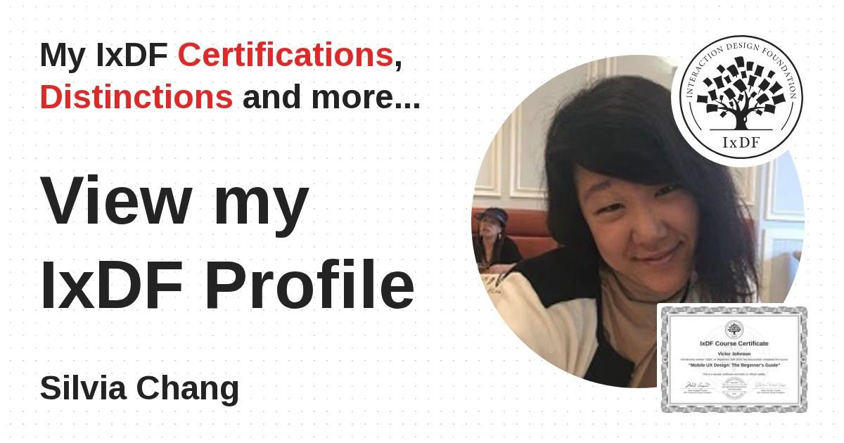 Distinctions are conferred upon Silvia Chang in formal recognition of their notable achievements and contributions, as stipulated by the IxDF Educational Codex.