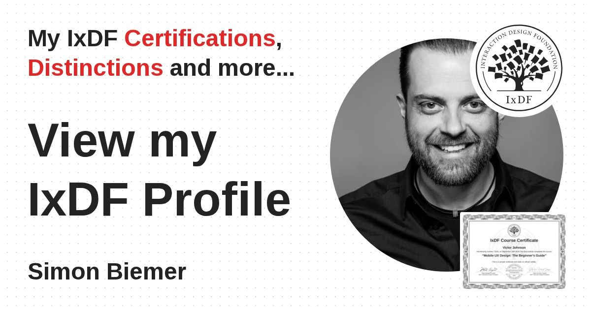 IxDF Course Certificates are awarded to Simon Biemer in formal recognition of their coursework surpassing the rigorous benchmarks of exceptional performance established by the IxDF Educational Codex.
