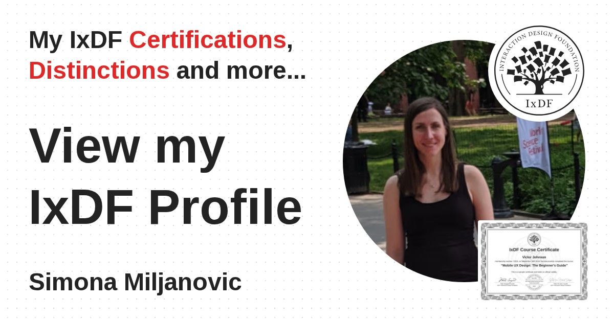 IxDF Course Certificates are awarded to Simona Miljanovic in formal recognition of their coursework surpassing the rigorous benchmarks of exceptional performance established by the IxDF Educational Codex.