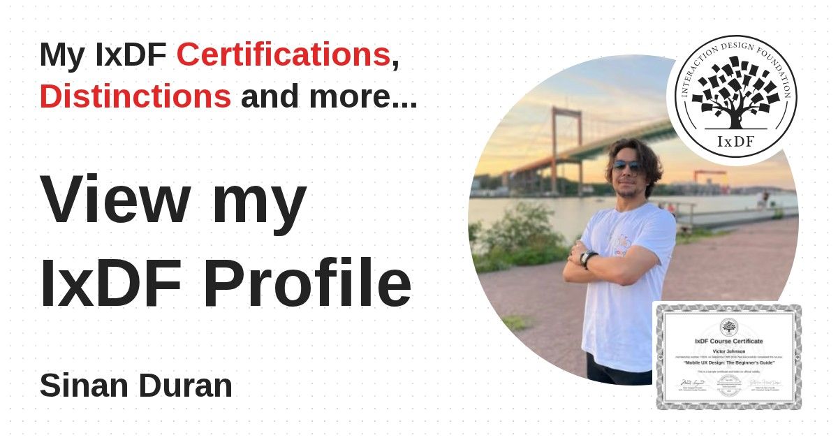 IxDF Course Certificates are awarded to Sinan Duran in formal recognition of their coursework surpassing the rigorous benchmarks of exceptional performance established by the IxDF Educational Codex.